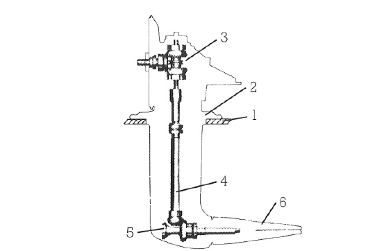 Hull. 2 Seal. 3 Ahead/astern/neutral gears. 4 Drive shaft. 5 Bevel gear. 6 Folding propeller.