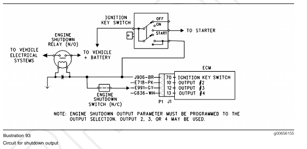 The circuit is connected to the correct ECM terminal that is selected for the “Engine Shutdown Output”.