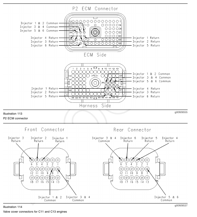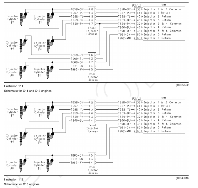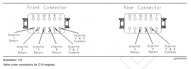 The “Injector Solenoid Test” on Cat ET should be used to aid in diagnosing an open circuit or a short circuit diagnostic code while the engine is not running. The “Injector Solenoid Test” will send a signal to each solenoid. The electronic service tool will indicate the status of the solenoid as “OK”, “Open”, or “Short”. An open circuit or a short circuit in the common wire will cause two cylinders to have diagnostic codes.