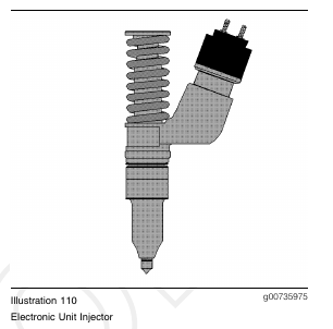 These engines have Electronic Unit Injectors (EUI) that are mechanically actuated and electronically controlled. The engine control module sends a 105 volt pulse to each injector solenoid. The pulse is sent at the proper time and at the correct duration for a given engine load and speed. The solenoid is mounted on top of the fuel injector body. The 105 volt pulse can be individually cut out to aid in troubleshooting misfire problems.