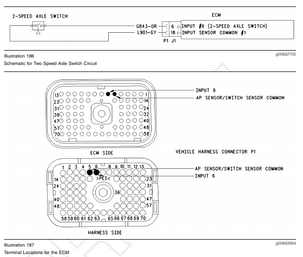 If a two-speed axle is used, the change in gear ratios alters the calibration of the vehicle speed signal. When the Two-Speed Axle Switch is in the ON position, the ECM will automatically adjust the vehicle speed calibration. This will ensure that the ECM driven speedometer and the stored information in the ECM correctly reflect the actual vehicle speed. In order for this feature to function properly, the “Low Speed Range Axle Ratio” and “High Speed Range Axle Ratio” parameters must be programmed. If the “Two Speed Axle Switch” parameter is programmed to “None” (default), this feature is not used. If the “Two Speed Axle Switch” parameter is programmed to J1/P1:6, the feature is available and the switch circuit should be connected to terminal 6 of the J1/P1 ECM connector. The switch can also be connected through the J1939 data link.