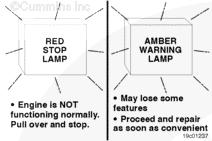 The fault code warning lamps let the operator know when a part or a system fault is detected. The amber lamp can have the word WARNING printed on it. The red lamp can have the word STOP printed on it