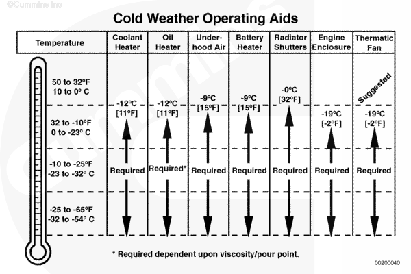 It is possible to operate gas engines in extremely cold environments if they are properly prepared and maintained. The correct lubricants, fuels, and coolant must be used for the cold weather range for which the vehicle is being operated. Refer to the chart below for recommendations in different operating ranges.