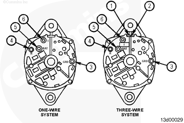 This is the simplest of the wiring systems because the only wires connected to the alternator are at the battery (BAT) and ground terminals. (See Table 5.) Connecting to the R terminal and I terminal is optional.