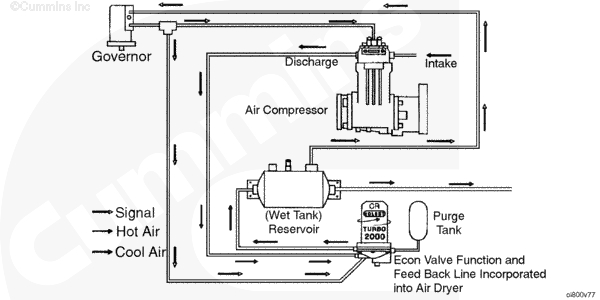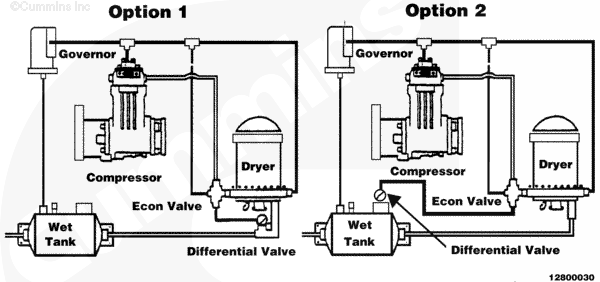 NOTE: To prevent overnight or shutdown freeze-ups of the Econ valve not conforming to the 610 to 2134 mm [2 to 7 ft] Econ valve location, make sure that the vehicle wet tank is drained to below governor cut-in pressure (via wet tank drain valve) following vehicle shutdown. This action will open the Econ valve and allow compressor air flow at vehicle start-up.