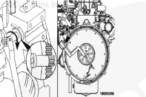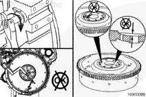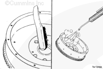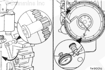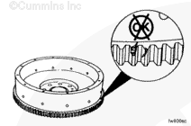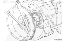 Use the barring tool, Part No. 3824591, to rotate the crankshaft one complete revolution. Measure the flywheel runout at four equal points on the flywheel.