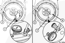 Use the dial indicator gauge (1), Part No. 3376050, or its equivalent, and dial gauge attachment (2), Part No. ST-1325, to inspect the flywheel bore (3) and the surface (4) runout.