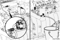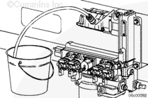 After the fuel lift pump stops running and with the engine operating at idle, disconnect the hose to the catch container.