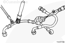 It is possible for the turbocharger actuator coolant return hose to contact the turbocharger coolant return hose when the fittings are torqued. Be sure to space the hoses apart while the fittings are torqued. If the hoses are
