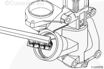 Clean the accumulated soot from the EGR valve inlet port using a wire brush, then soaking with carburetor cleaner and cleaning again with a wire brush. Be sure the loose soot is removed from the EGR valve housing. This can be done by vacuuming the soot out of the EGR valve inlet port.