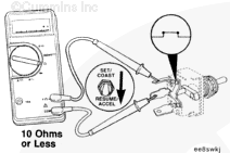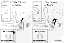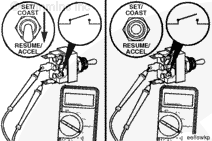 Hold the switch in the RESUME/ACCEL position. The multimeter must show a closed circuit (10 ohms or less) when the switch is held in the RESUME/ACCEL position.