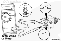 Hold the switch in the SET/COAST position. The multimeter must show an open circuit (100k ohms or more) when the switch is held in the SET/COAST position and after it is released. If the circuit is not open, the switch has failed.