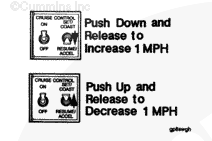 The RESUME/ACCEL position can also be used to increase the vehicle cruising speed. Hold the select switch in the RESUME/ACCEL position and the vehicle will increase in speed. When the switch is released, the cruising speed will be reset.