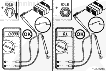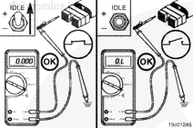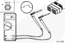 Hold the idle adjust switch in the negative (-) decrement position. The multimeter must show a closed circuit (10 ohms or less) when the switch is held in the decrement position and an open circuit (100K ohms or more) when the switch is released. The circuit must remain an open circuit when the switch is in the positive (+) increment position.
