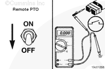 Make sure the switch is connected to the circuit. Move the remote PTO switch to the ON position. Measure the resistance with the multimeter. The multimeter must show a closed circuit (10 ohms or less). If the circuit is not closed, inspect the switch return wire and the remote PTO switch signal wire for an open circuit. Repair or replace the OEM harness, provided the switch has been previously checked. Refer to the OEM troubleshooting and repair manual for the procedures.