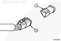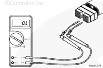 Insert a test lead into the SAE J1939 datalink positive (+) pin of the OEM harness connector, and connect it to the multimeter probe. Insert the other test lead into the SAE J1939 datalink positive (+) pin of the 9-pin Deutsch™ connector, and connect it to the multimeter.