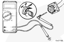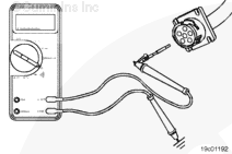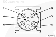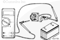 Remove the test lead from the SAE J1587 datalink negative (-) pin and insert it into battery positive (+) pin of the 6-pin connector. Touch the other multimeter probe to the engine block ground. Measure the voltage.