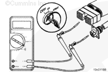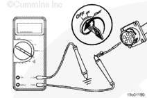 Turn the keyswitch to the ON position. Adjust the multimeter to measure VDC.