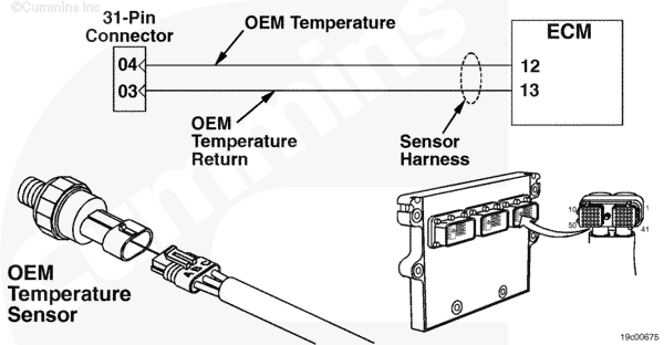 The OEM sensor signal is used by the electronic control module (ECM) to monitor the OEM temperature. The OEM temperature is used by the ECM for the engine protection system. A sensor that has failed low can be caused by a short circuit to ground on a supply or return wire, or an internally grounded (faulty) sensor.