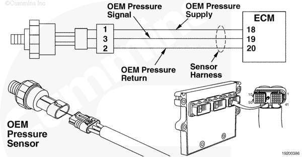 The OEM sensor signal is used by the ECM to monitor the OEM pressure. The OEM pressure is used by the ECM for the engine protection system. A sensor that has failed high can be caused by an open circuit in the signal or return wire, a voltage short in the signal or return wire, or a faulty sensor.
