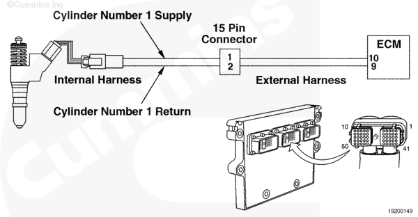 There are two pieces to an ISM and QSM actuator harness – one internal and the other external. The external portion of the actuator harness extends from the connector port in the ECM to the backside of the rocker lever housing. The external harness connects to the internal harness with a 15-pin connector at the backside of the rocker lever housing. The internal actuator harness runs along the inside of the rocker lever housing on the right side. It has six connectors spaced along its length – one for each injector solenoid. These connectors attach to the pigtail connector on each injector.
