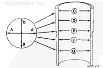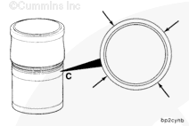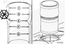 Measure the liner bore for out of roundness at points “C,” “D,” “E,” “F,” and “G.” Measure each point in the direction “AA” and “BB”. The bore must not be more than 0.10 mm [0.004 in] out-of-round.