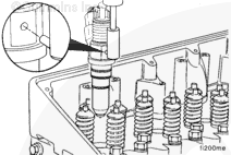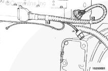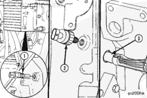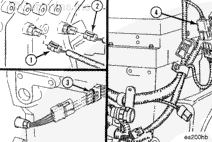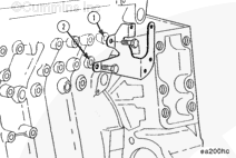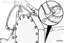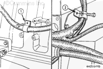 Install a wire clamp around the sensor harness and actuator fuel shutoff solenoid wire, and fastern the clamp to the cylinder block at point (1).