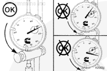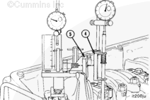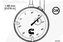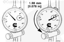 Read the push rod travel gauge counterclockwise from zero “0.” This travel represents the injection timing value. In the example shown, the value is 1.98-mm [0.078-in].