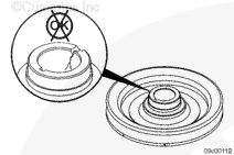 Install the dust seal onto the accessory drive pulley hub so that the larger outside diameter of the dust seal is facing away from the pulley. Push the dust seal onto the hub until the inside diameter of the dust seal is flush with the pulley hub end.
