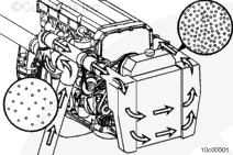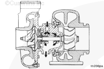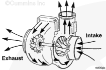 Variable Geometry Turbocharger: A variable geometry turbocharger is used on the automotive with CM870, automotive with CM875 and automotive with CM876 engines to maximize the performance of the engine and also to help decrease emissions levels. Variable geometry turbochargers have quicker response time, and quicker engine deceleration for quicker shifting than fixed geometry turbochargers. Because of the active control of the variable geometry turbocharger, the intake manifold pressure and turbocharger sound can often change. There is not a loss of power associated with the change in intake manifold pressure; however, customer perception of engine power can be affected. Typically, when the intake manifold pressure and turbocharger sound are changing during steady state operation, the ECM is adjusting the EGR flow into the engine and the engine’s power is not affected. When the throttle is released, perhaps for a gear change, the variable geometry actuator closes. This prepares the turbocharger to be ready to build intake manifold pressure quickly to provide improved turbocharger response when the throttle is depressed after the gear change. Because of this design for improved turbocharger response, after releasing the throttle, the engine speed of the ISM engine with a variable geometry turbocharger can decrease more quickly than an engine without a variable geometry turbocharger. Fast deceleration of engine speed can cause the drivers to adjust shifting styles until becoming accustomed to the different deceleration speeds. Due to the variable geometry mechanism being contained inside the turbine housing, it is mandatory that the V-band clamp is not disturbed during turbocharger servicing. Loosening the V-band clamp and rotating the bearing housing or turbine housing can cause the variable geometry mechanism to jam and the turbocharger to fail. Service turbochargers with the proper turbine housing orientation are available so that no adjustments are necessary. Similar to all of Cummins® electronically controlled heavy duty engines, the ISM engine with variable geometry turbocharger incorporates a power derate to protect the turbocharger from damage while operating in high altitudes. The variable geometry turbocharger meets or exceeds the power output of the engines with a fixed geometry turbocharger at most altitudes. At and around 2.438 km [8000 ft] elevation, however, a slight power decrease can be noticeable when operating the engine with a variable geometry turbocharger and comparing its performance to an engine with a fixed geometry turbocharger. Automotive with CM875 The automotive CM875 and CM870 engines with variable geometry turbocharger is pneumatically actuated with air from the OEM air tanks. High air pressure from the turbocharger control valve closes the variable geometry mechanism, which increases the exhaust gas pressure and facilitates EGR flow through the engine. A closing variable geometry mechanism also increases turbocharger speed and intake manifold pressure under certain engine operating conditions. Lower air pressure from the turbocharger control valve opens the variable geometry mechanism, which decreases exhaust gas pressure, turbocharger speed, and intake manifold pressure under certain engine operating conditions.