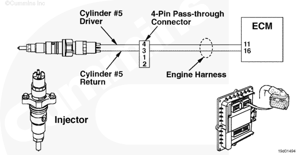 The injector solenoid valves are actuated by the electronic control module (ECM) to control fuel metering and timing. Each injector solenoid is connected to the ECM by a driver wire and a return wire. An electrical pulse is sent to the injector from the ECM on the driver wire and returns to the ECM on the return wire after actuating the solenoid. Each solenoid valve is normally closed, and it is only opened by an electrical pulse from the ECM during fuel injection and metering.
