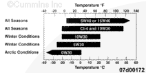 Cummins Inc. primary recommendation is for the use of 15W-40 multigrade for normal operation at ambient temperatures above -15°C [5°F]. The use of multigrade oil reduces deposit formation, improves engine cranking in low temperature conditions and increases engine durability by maintaining lubrication during high temperature operating conditions. Since multigrade oils have been shown to provide approximately 30 percent lower oil consumption, compared with monograde oils, it’s important to use multigrade oils to be certain your engine will meet applicable emissions requirements. While the preferred viscosity grade is 15W-40, lower viscosity multigrades can be used in colder climates. Refer to the accompanying chart.