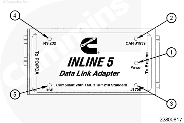 The INLINE™ 5 is an RP1210A compliant data link adapter that will support both J1587/J1708, and J1939 protocol. It can be used with either a COM port or USB port. The INLINE™ 5 must be configured correctly within INSITE™ electronic service tool to define the COM or USB port being used on the PC and the type of data link protocol that is available, either J1587/J1708, or J1939.