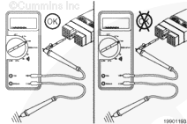 The multimeter must show an open circuit (100k ohms or more). If a closed circuit is measured between any pins, there is a short circuit between the applicable pins. Repair or replace the engine harness. Refer to Procedure 019-204 to repair the harness, and Procedure 019-043 to replace the harness. to replace the harness.