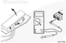 The multimeter must show 10 ohms or less for separate sensor/switch pedals and 125 ohms or less for integrated sensor/switch pedals when the pedal is depressed to the OFF-IDLE zone.