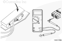 Measure the voltage from the active off-idle signal pin in the ECM connector to engine block ground. The multimeter must show a measurement of 1.5 VDC or more. If the voltage is not to specification in either step, repair or replace the engine harness. Refer to Procedure 019-204 to repair the harness, and Procedure 019-043 to replace the harness.