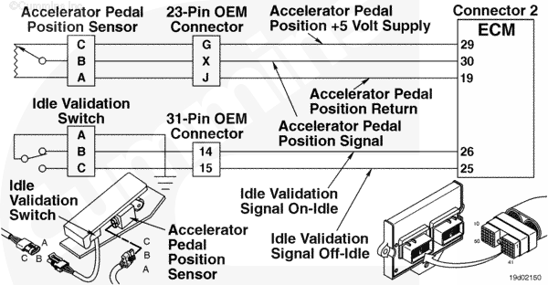 This signal is a 0- to 5.0-VDC signal from the foot pedal potentiometer to the ECM. At a foot pedal position of 100 percent closed, a 5.0-VDC signal will be output from the pedal. The wiring between the accelerator pedal and the OEM connector will be a twisted pair.