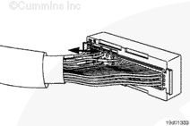 Remove the connector shell by slightly bending the connector shell (black) away from the two tangs that hold the shell to the ECM connector (red).