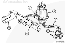 If the pressure drop across the heat exchanger is within specification, determine the pressure drop across the exhaust elbow (diffuser). This is done by subtracting the heat exchanger outlet pressure form the sea water pump outlet pressure. If this pressure exceeds the maximum specification, check for blockage in the exhaust elbow (diffuser) and exhaust system of the vessel. Clean or replace if necessary.