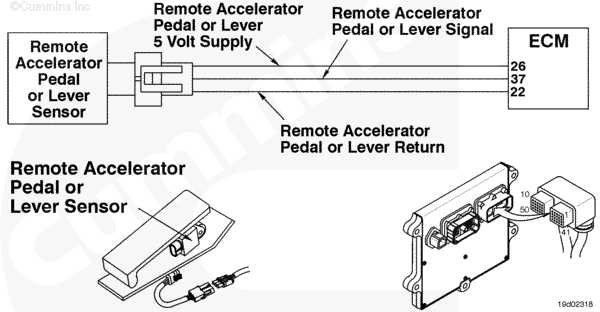 The remote accelerator pedal or lever location varies with each original equipment manufacturer (OEM). Refer to the OEM troubleshooting and repair manual.