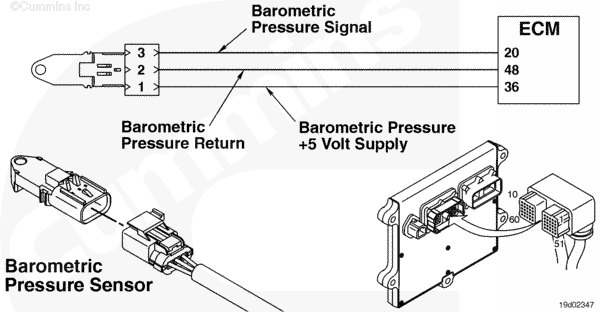 The electronic control module (ECM) provides a 5 volt supply to the ambient air pressure sensor on the sensor supply 1 circuit. The ECM also provides a ground on the sensor return circuit. The ambient air pressure sensor provides a signal to the ECM on the ambient air pressure sensor signal circuit. This sensor signal voltage changes based on the pressure of the atmosphere. The ECM will detect a low signal voltage when the vehicle is operating at high altitudes. The ECM will detect a high signal voltage when the vehicle is operating at sea level altitudes.