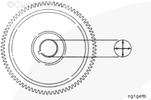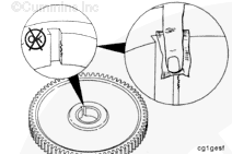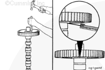 Align the gear keyway with the key in the camshaft, and install the gear. The timing marks and the gear part number must be facing away from the camshaft.