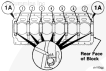 The main bearing caps are marked for position (1) on the camshaft side and the cylinder block identification (2) on the exhaust side. The cylinder block identification number (3) is stamped on the pan rail on the camshaft side of the block. Install the caps in the correct position with the position number to the camshaft side and its part number toward the rear of the engine.