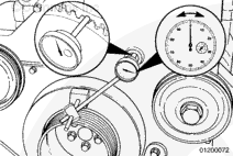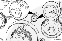 Setup a dial indicator gauge, Part Number 3376050, and extension, Part Number ST-537-4, with a magnetic base on the front of the cylinder head or vibration damper. Place the tip of the indicator on the face of the camshaft gear through the gear cover inspection hole.