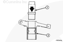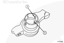 NOTE: The oil holes in the rocker lever bore (1) and the oil holes in the bushing (2) must be aligned correctly to supply oil to the adjusting screws, the crossheads, and the injector link.