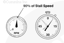 Perform the previous Stall Speed Check procedure through the “check the engine speed (rpm) at the point of stall” step then quickly move the throttle to the full open position and start the stop watch at the same time