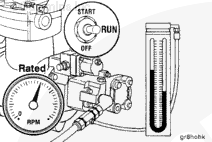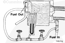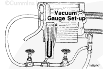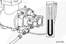 Remove the fuel supply hose to the gear pump and install the manometer, Part Number ST-1111-3. Use the appropriate hose adapter for the specific engine being serviced.