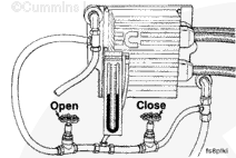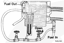 Remove the fuel line from the rear of the cooling plate (fuel in). Install one side of the manometer hose into the fuel line. Connect the line to the cooling plate. Connect the other side of the manometer hose into the line from the front of the cooling plate (fuel out). Make sure both valves are closed.