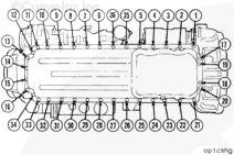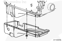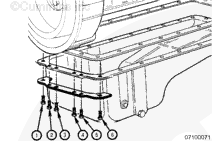Capscrews 1 through 6 are longer than the rest of the oil pan capscrews to accommodate the thickness of the clamping plate.