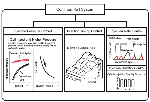 Because the engine ECU controls the injection system (including the injection pressure, injection rate, and injection timing), the injection system is independent and thus unaffected by the engine speed or load.